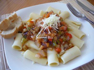 Macarrones a la salsa de alcaparras, berenjena y pimientos
