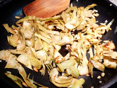 3. Calentamos aceite en una sartén y sofreímos el ajo picado y los piñones, teniendo cuidado de que no se quemen. Añadimos las alcachofas bien escurridas, salamos y dejamos a fuego medio unos 8-10 minutos.